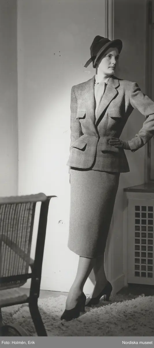 Modell poserar i dräkt, hatt och handskar vid stol.