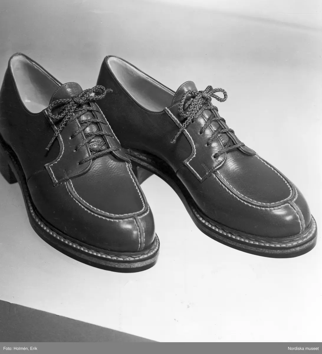 Promenad- och sportskor. Verkligt gedigna med impregnerade yttersulor, mellansulor av naturkork. Becksöm och skyddsrand, ovanlädret är av sportkalv. Ljusa stickningar.
