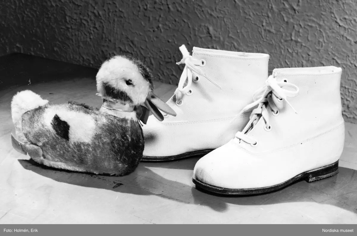Ett par vita barnskor och en leksaksanka.