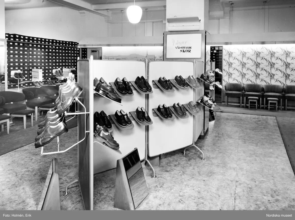 "Vårens välsittande skor." Interiör från Nordiska Kompaniet skoavdelning.