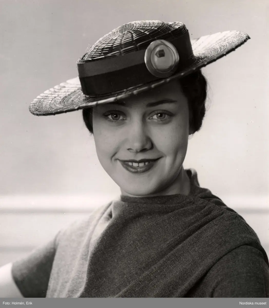 Modell iklädd stråhatt. Nordiska Kompaniet, hattmode.