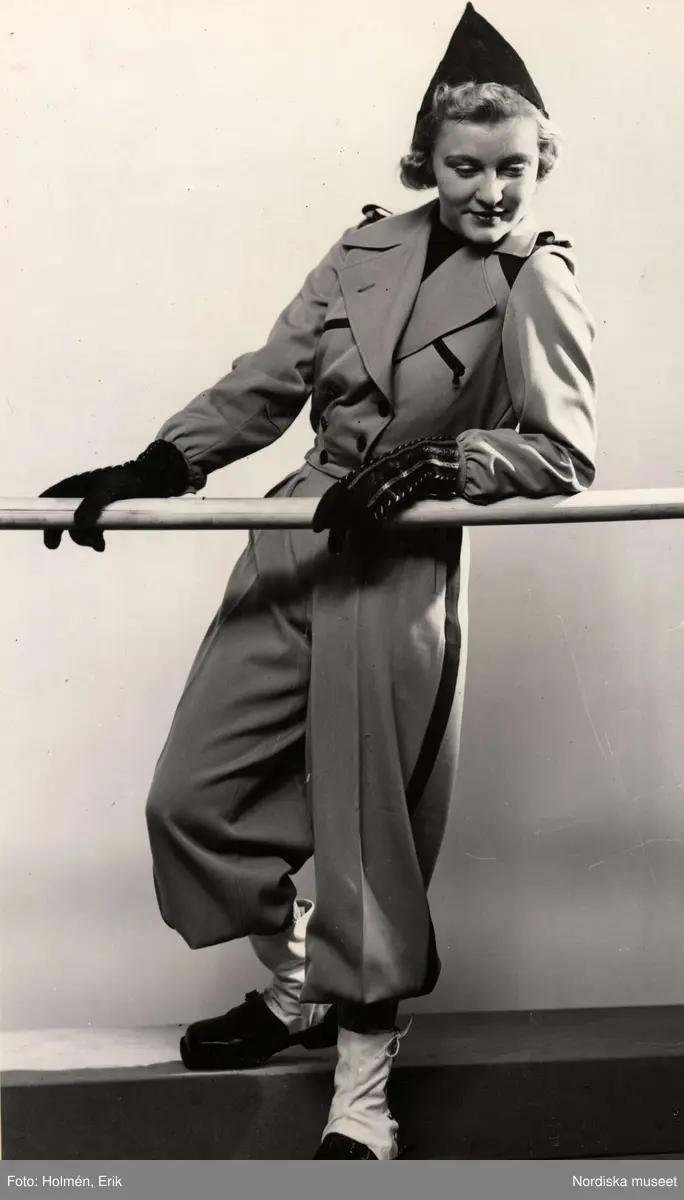 Dammode för vinter och friluftsliv. En kvinnlig modell iklädd byxdress, stövlar, handskar och mössa står och lutar sig mot en ledstång. Nordiska Kompaniet.