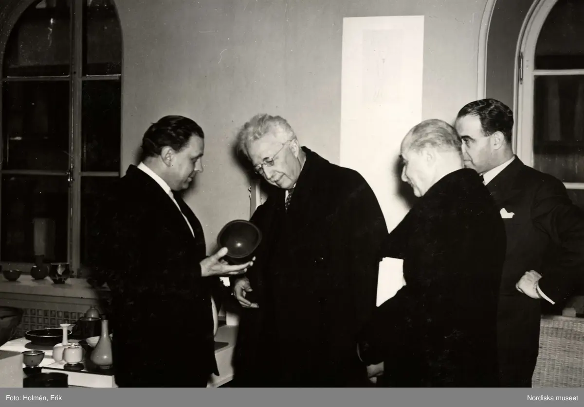 Gustavbergs porslinfabrik utställning. F v. konstnären Kåge, Prins Eugen, Generalkonsul J. Sachs och Direktör Ragnar Sachs. Nordiska Kompaniet.