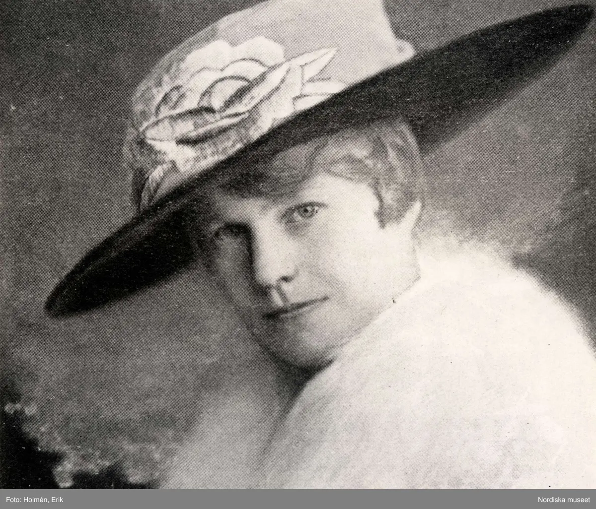 Modebild från 1916, kvinna iförd vidbrättad hatt med blomapplikation och stor pälskrage, Nordiska Kompaniet.