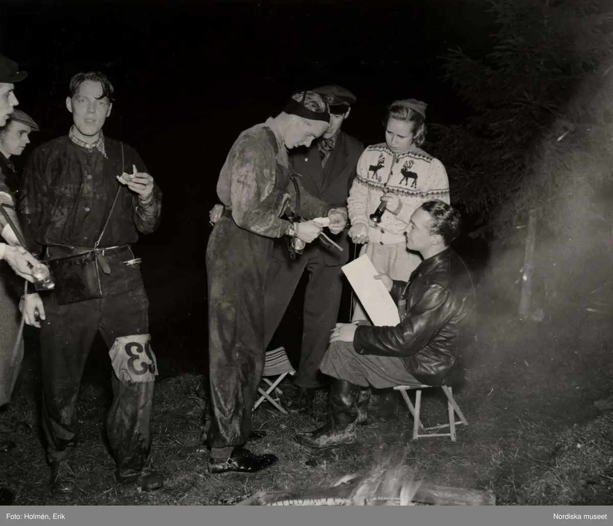 Nattorientering, män och en kvinna i mörker står runt en man som sitter på en fällstol intill en eld. Nordiska Kompaniet 1940.