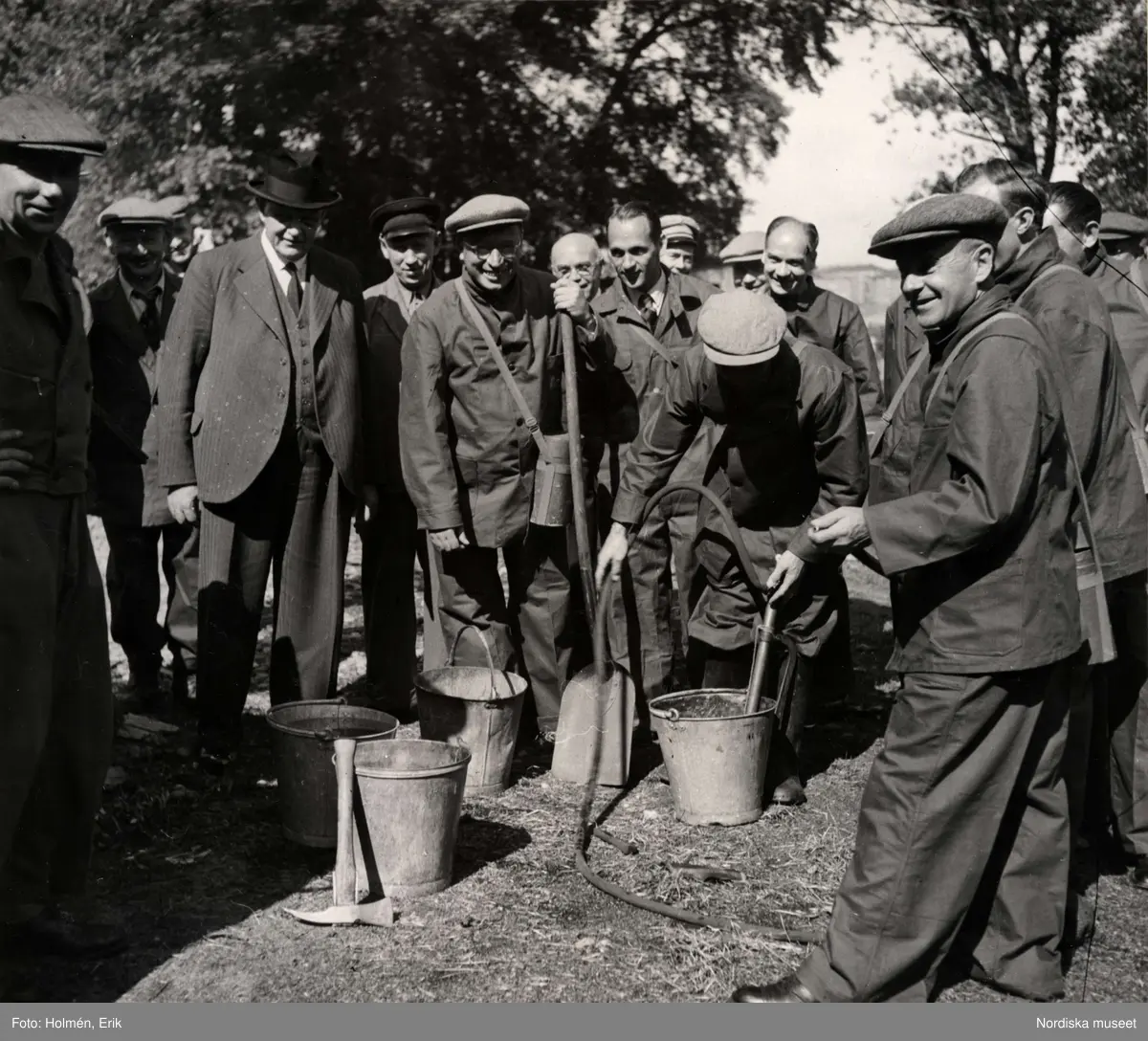 Nordiska Kompaniets industriskydd under övning 1941. En grupp män, de flesta i skyddskläder, står tillsammans utomhus försedda med hinkar, redskap och slangar.