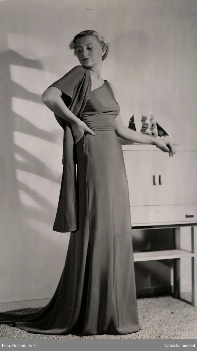 Dammode, AB Nordiska Kompaniet, NK. Kvinna i lång klänning.