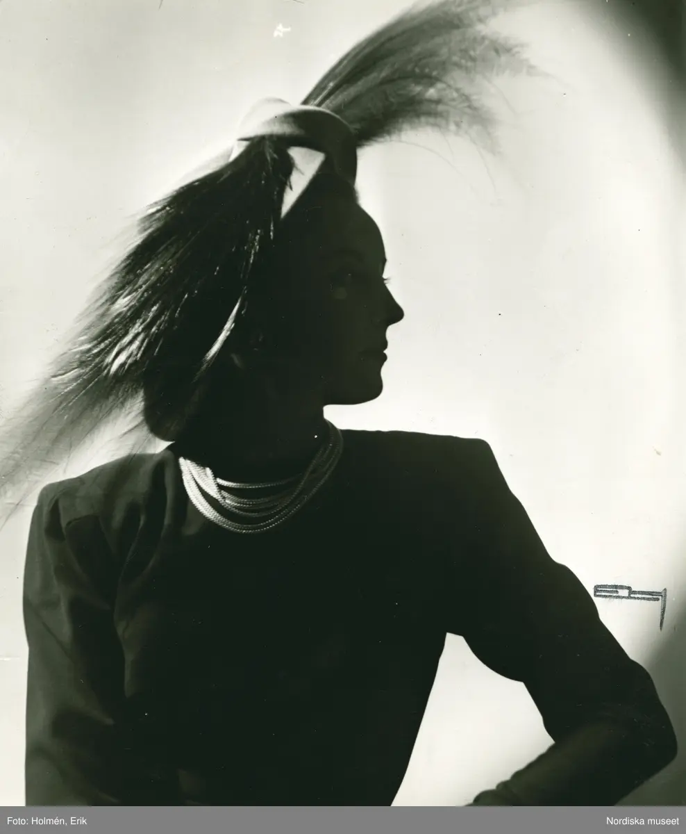 Porträtt av kvinna i hatt med långa strån, samt halsband.
