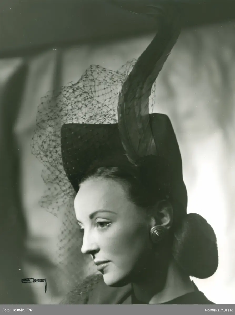 Porträtt av kvinna i hatt med fjäder och mörkt flor av Rose Valois, samt örhängen och chinjong.
