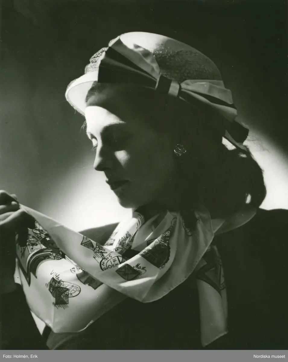 Porträtt av kvinna i hatt med rosett på sidan, samt örhängen och scarf.