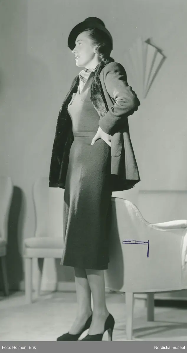 Helporträtt av kvinna klädd i knälång kjol och tröja, jacka med pälskrage, hatt och pumps. Vita stolar i bakgrunden.