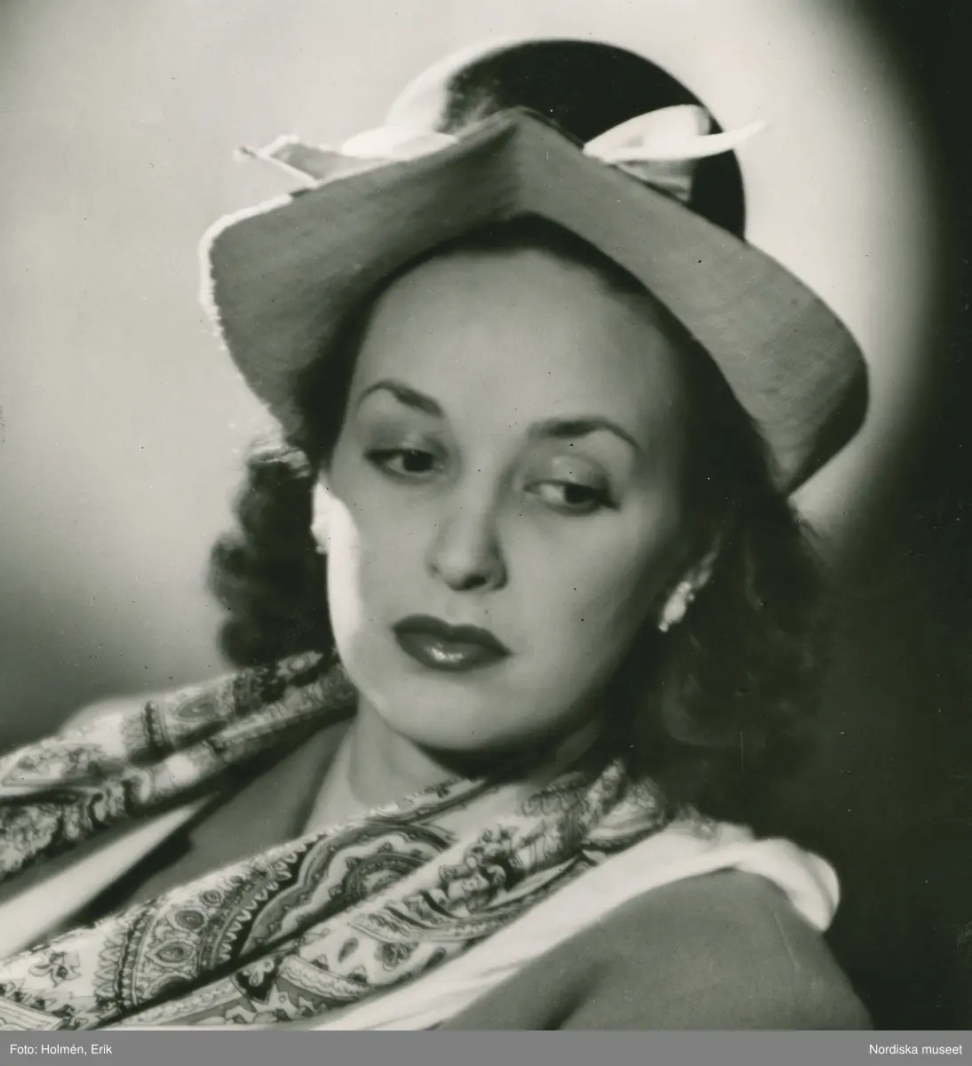 Porträtt av kvinna i hatt med vitt hattband och scarf, av Otto Lucas.