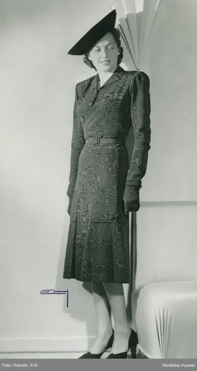 Helporträtt av kvinna i knälång klänning med mönster, hatt, handskar och pumps.