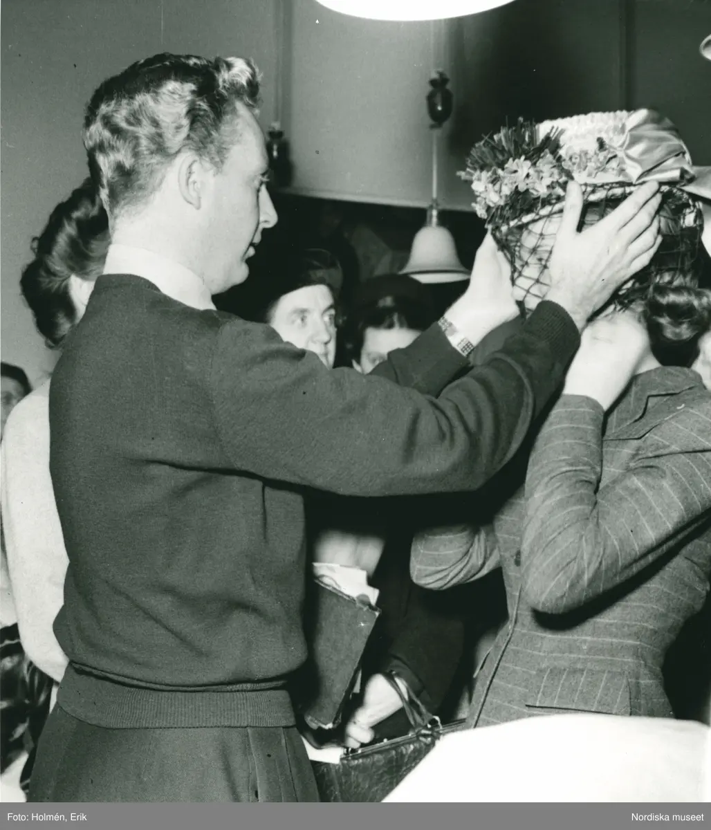 Monsieur Erik provar stråhatt dekorerad med blommor och band på modell.