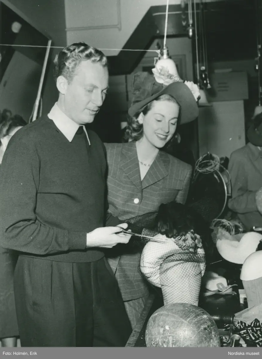 Monsieur Erik med modell i hatt framför hattstockar med hattar.