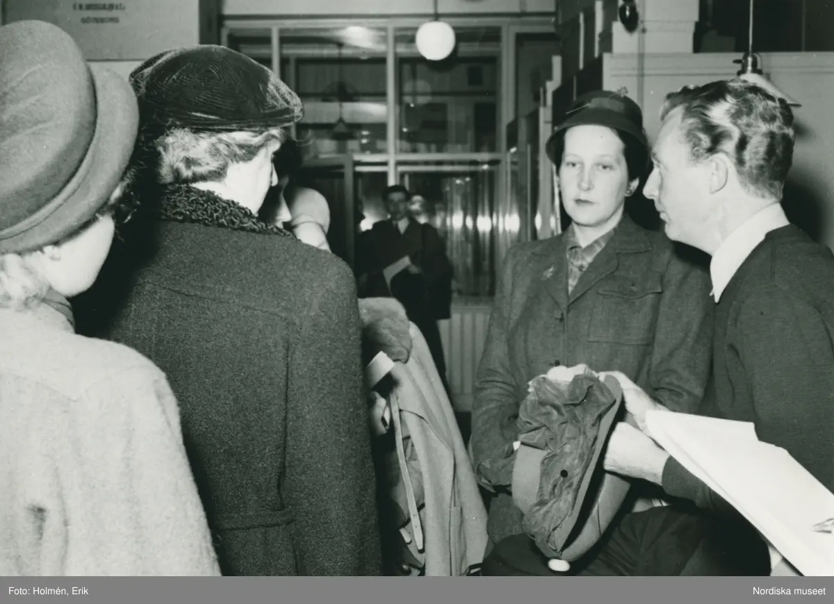 Monsieur Erik med hatt i handen bredvid tre kvinnor klädda i hatt.