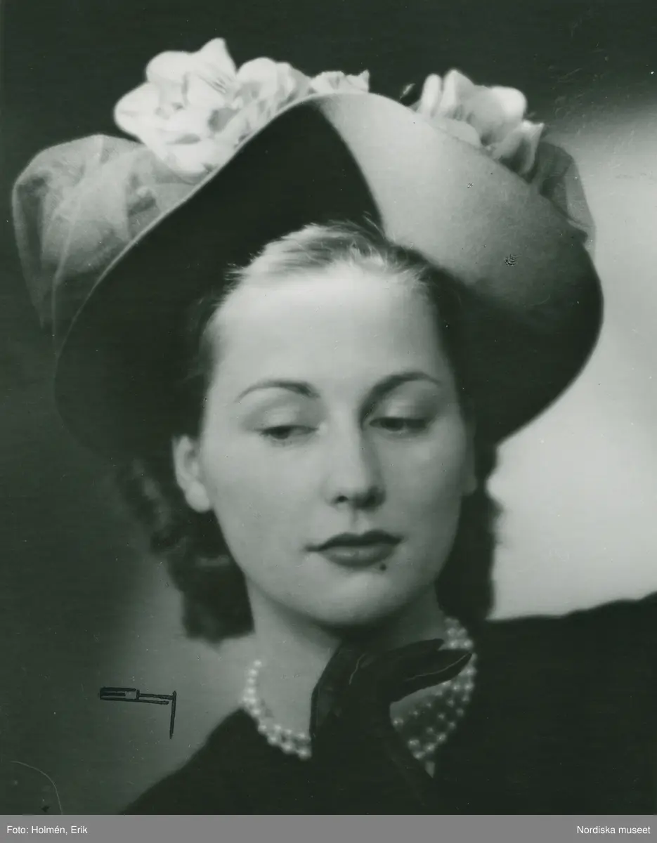 Porträtt av kvinna i hatt med blomsterdekoration, av Monsieur Erik.