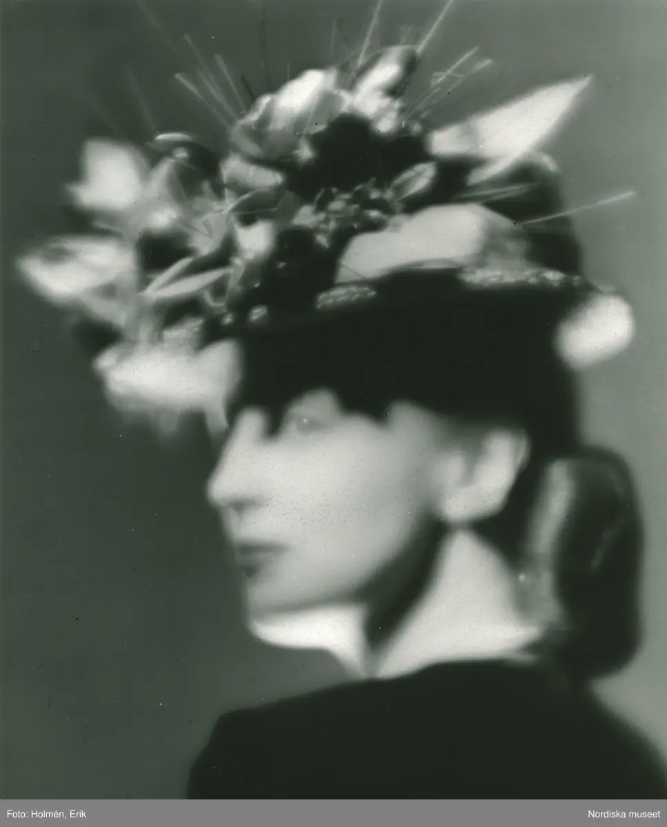 Porträtt av kvinna i hatt med dekorationer, av Monsieur Erik.