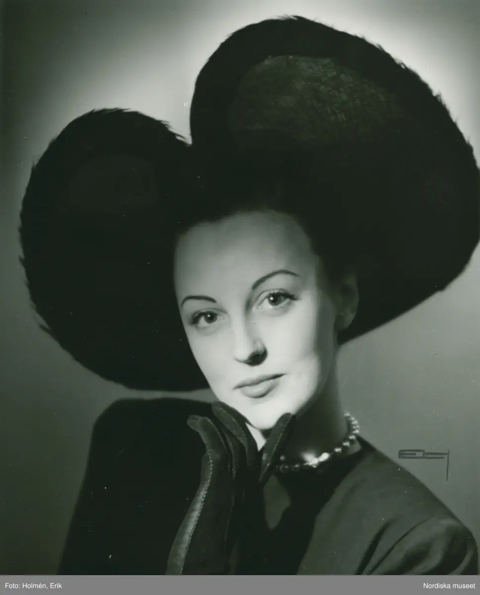 Porträtt av kvinna i svart hatt med kant av fjädrar. Uppvisning mars 1947. Hattar använda vid franska avdelningen.