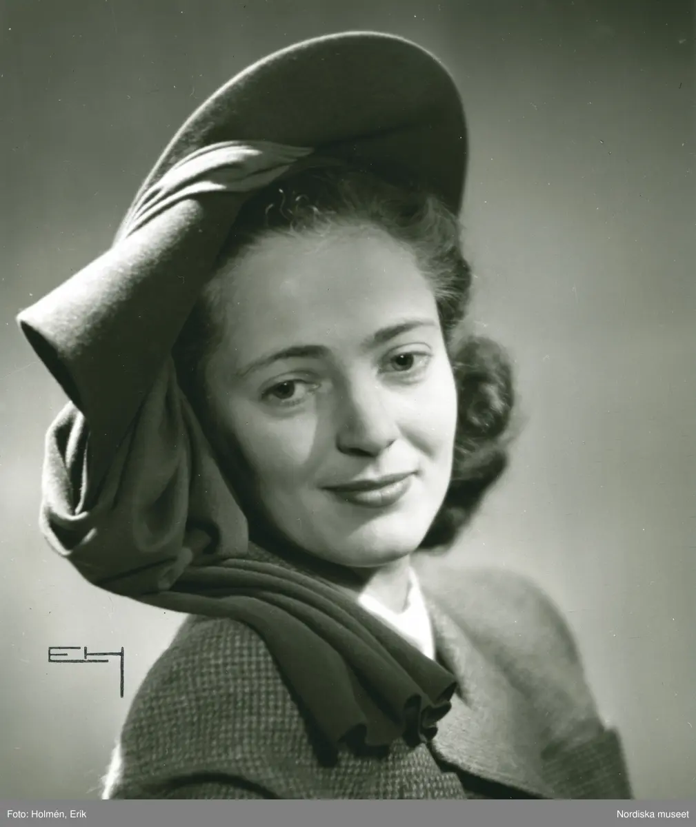 Porträtt av kvinna med hatt i grön filt med garnityr av brun jersey. Hatt använd vid franska avdelningens uppvisning september 1947.