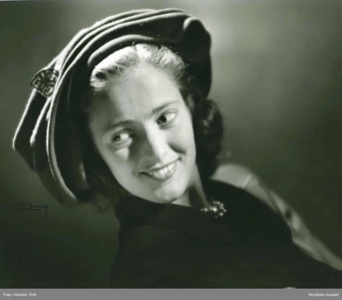 Porträtt av kvinna med hatt i brun filt med guldnål. Hatt använd vid franska avdelningens uppvisning september 1947.