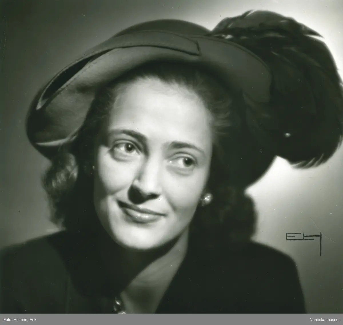 Porträtt av kvinna med hatt i röd filt med fjäder. Hatt använd vid franska avdelningens uppvisning september 1947.