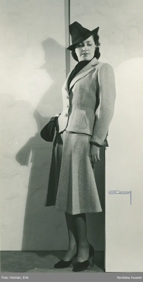 Helporträtt av modell i dräkt av Jeanne Paquin, samt hatt, pumps och handskar i handen.