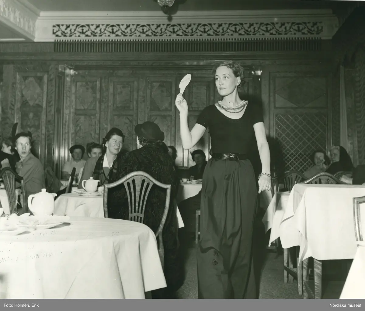 Modevisning på Nordiska Kompaniet, Modell i mörk top, skärp och hellång kjol. Publik sitter vid runda bord.