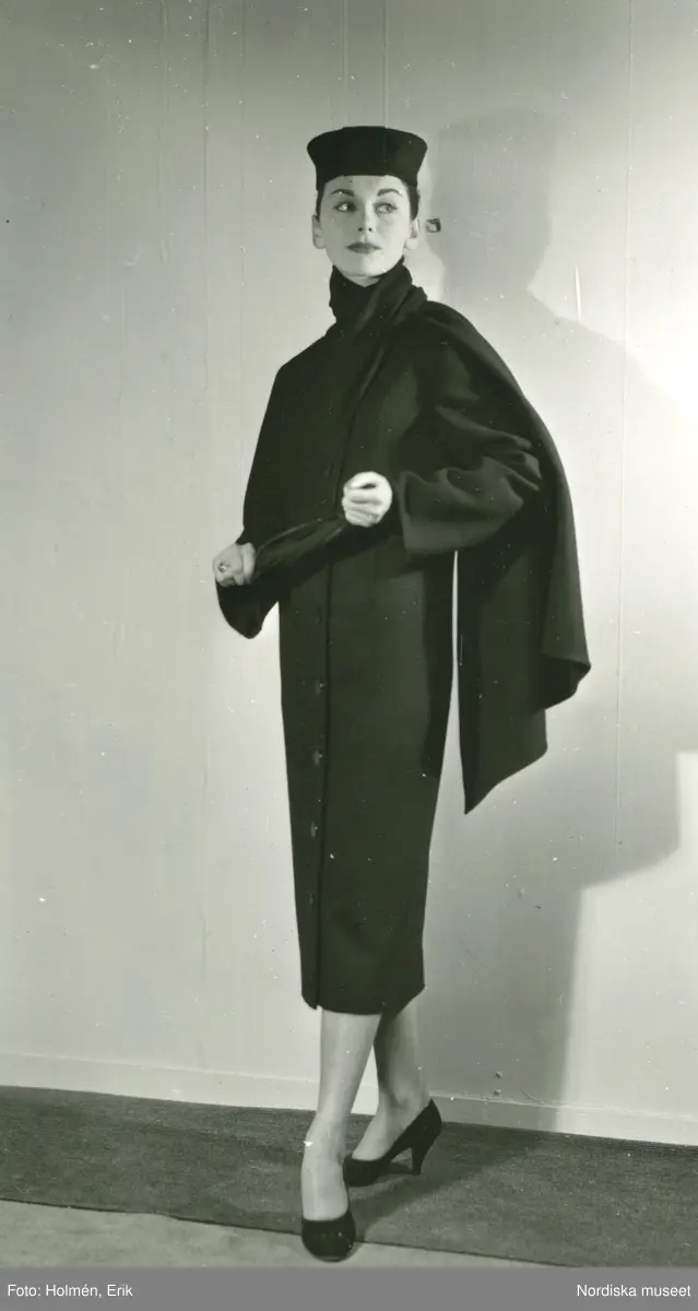 Modell visar höstkollektion. Mörk kappa med halsduk, hatt och pumps.
