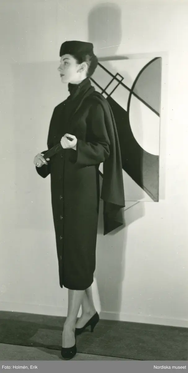 Modell visar höstkollektion, klädd i mörk kappa, halsduk, hatt och pumps, framför konstverk.