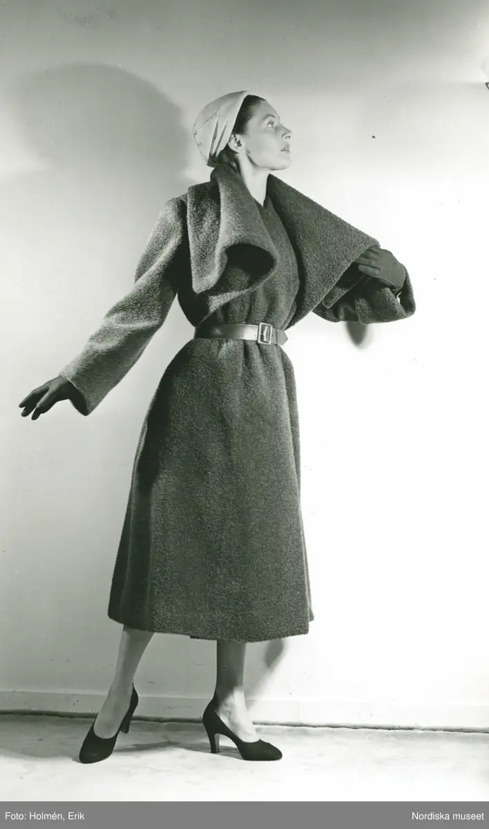 EM "Modellbutik", Nordiska Kompaniet, Damkonfektion. Modell i yllekappa med bred krage, hatt, handskar och pumps.