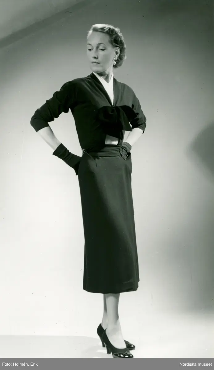 EM "Modellbutik", Nordiska Kompaniet, Damkonfektion. Modell i mörk klänning med svart dekoration framtill, samt handskar och pumps.