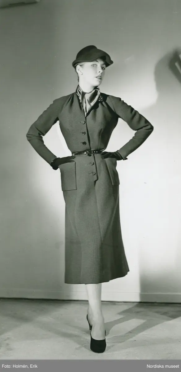 EM "Modellbutik" Nordiska Kompaniet, Damkonfektion. Modell i klänning med skärp och sidenscar , hatt, handskar och pumps. Från Christian Dior.