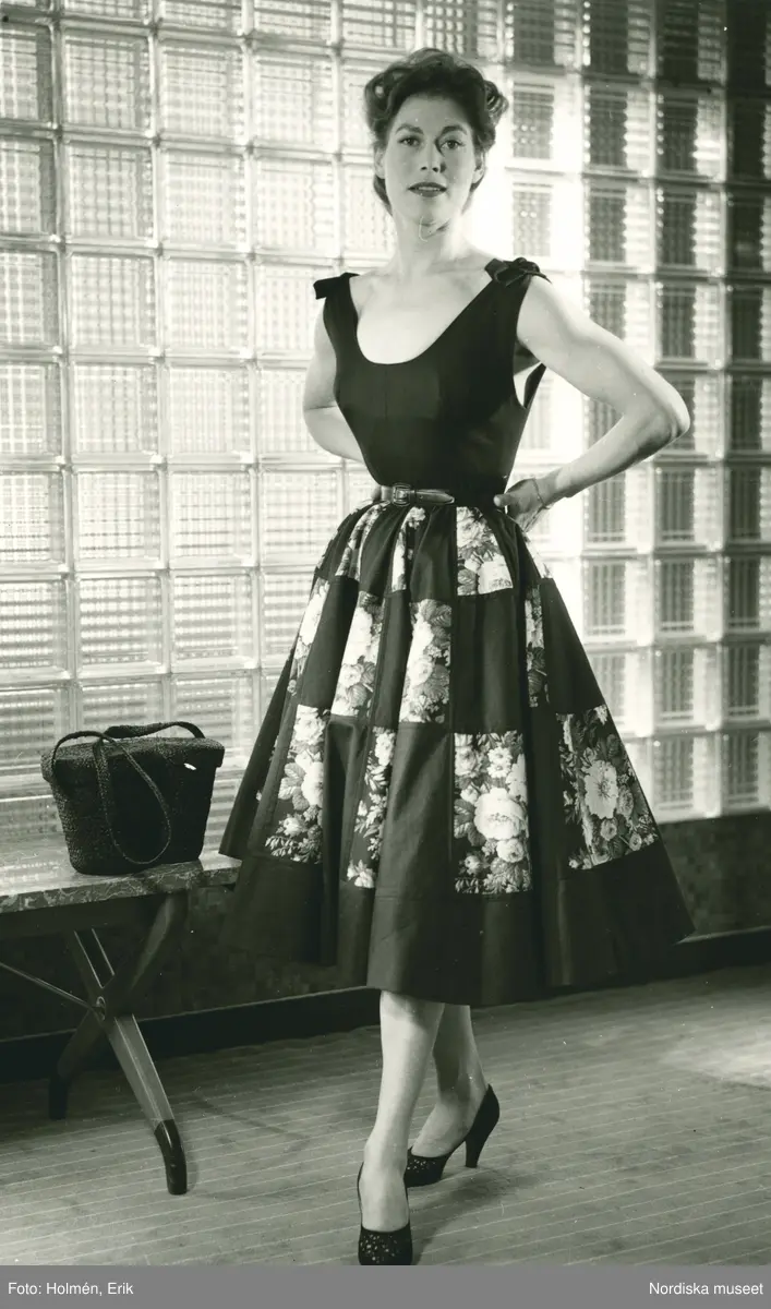 EM, Modellbutiken, Nordiska Kompaniet, Damkonfektion. Modell i klänning med mörk överdel och mönstrad kjol och pumps. stråväska på bord. Betongglas i bakgrunden.