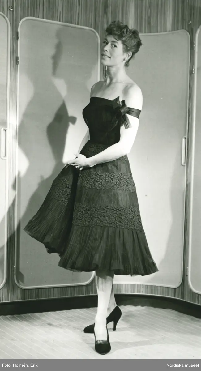 EM, Modellbutiken, Nordiska Kompaniet. Uppvisning i lunchrummet. Damkonfektion. Modell i klänning med spets och plisserad tyll.