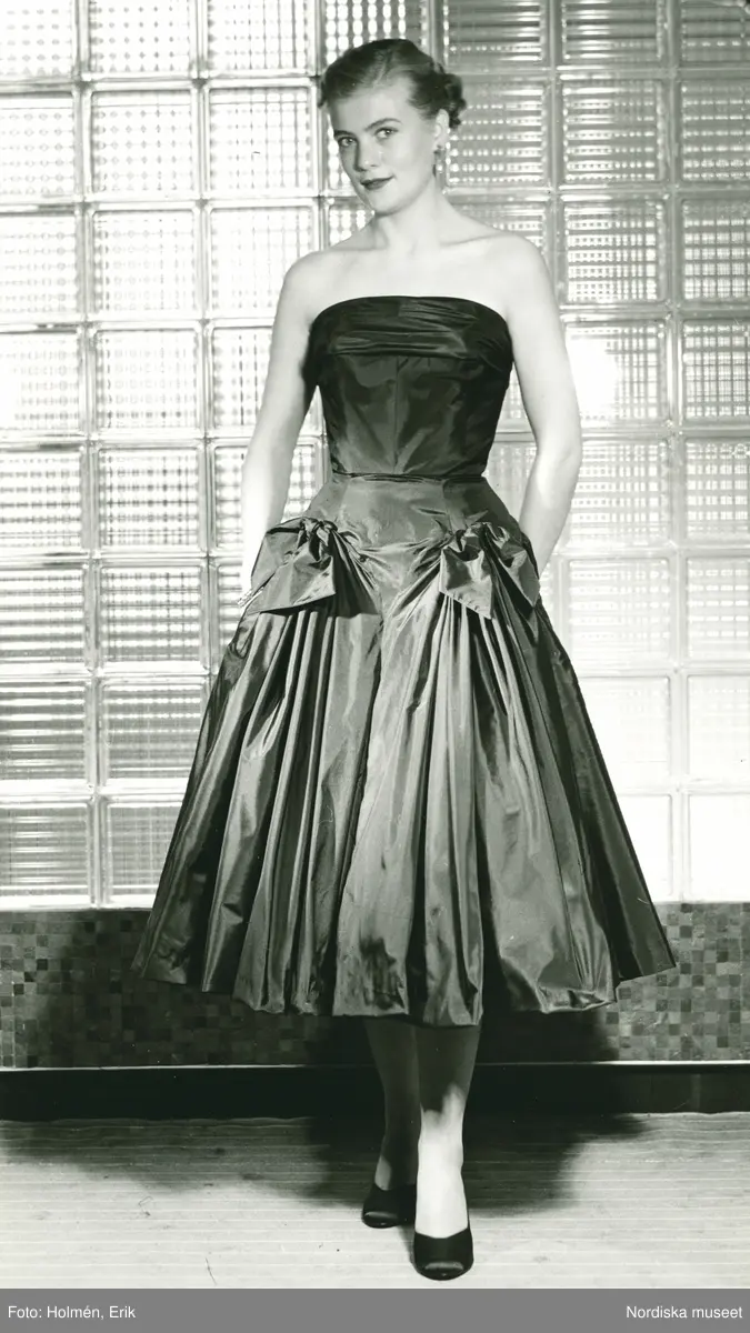 EM, Modellbutiken, Nordiska Kompaniet. Uppvisning i lunchrummet. Damkonfektion. Modell bär klänning i helsidentaft .