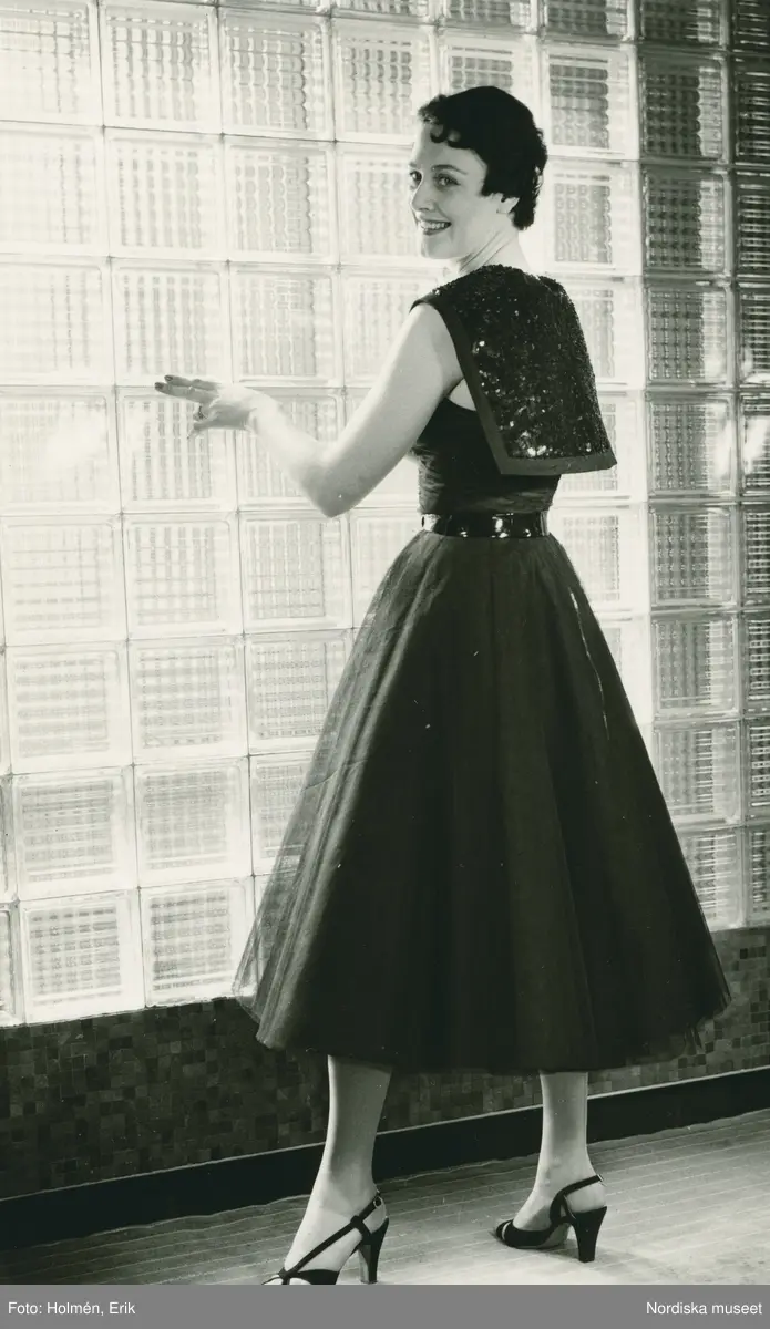 EM, Modellbutiken, Nordiska Kompaniet, Damkonfektion. Modell i klänning med utställd kjol, sjal med paljetter och pumps, står framför vägg i betongglas.