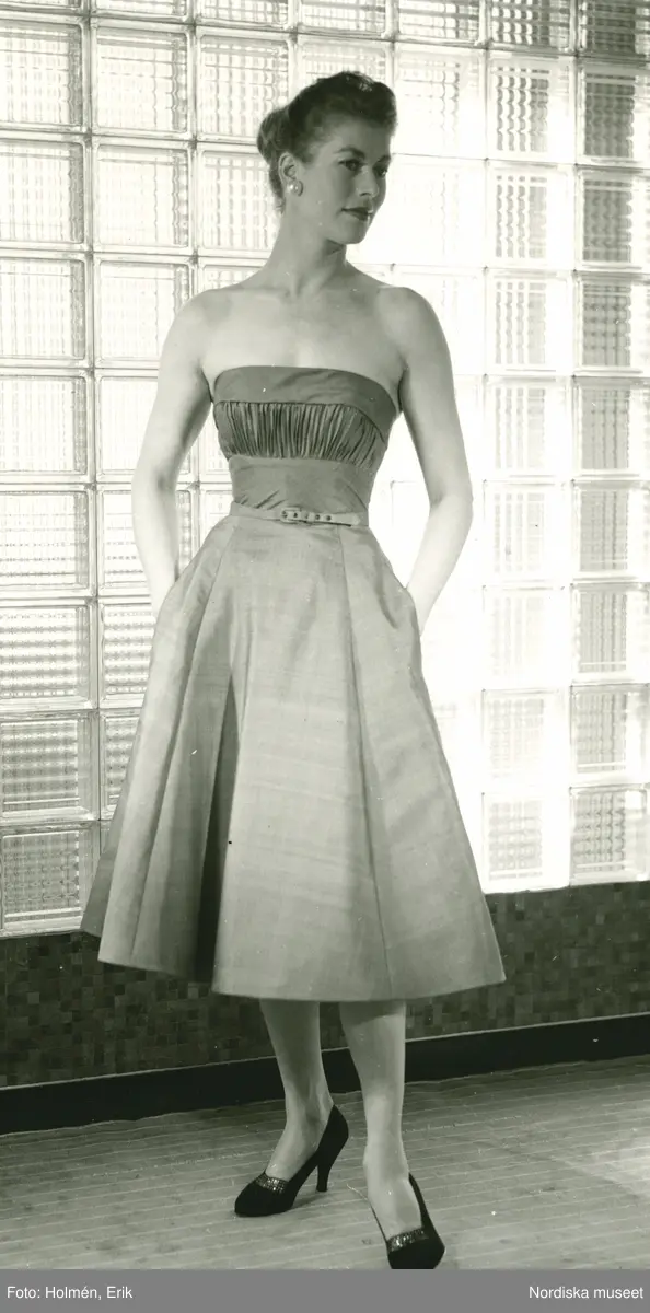 EM, Modellbutiken, Nordiska Kompaniet, Damkonfektion. Modell i axelbandslös klänning och pumps.