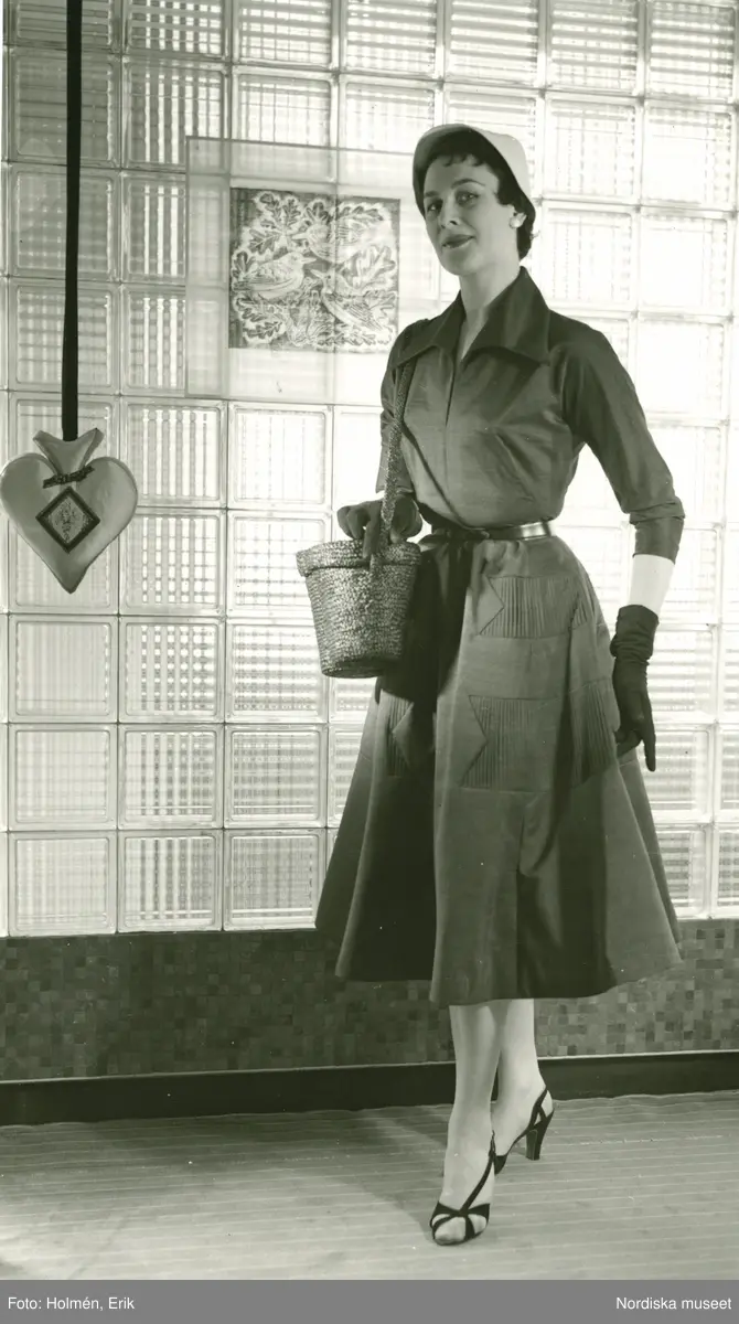 EM, Modellbutiken, Nordiska Kompaniet, Damkonfektion. Modell i tröja, kjol, hatt, handskar, väska och sandaletter.