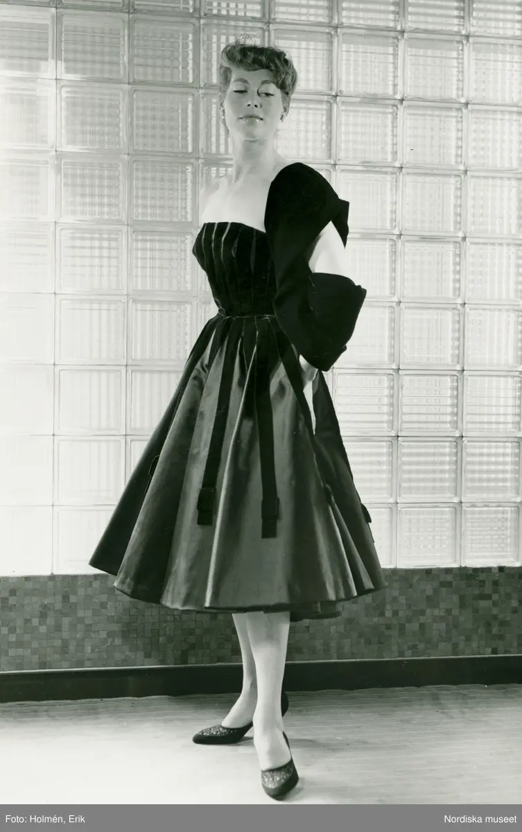 EM, Modellbutiken, Nordiska Kompaniet. Uppvisning i lunchrummet. Damkonfektion. Modell bär klänning i duchesse med sammetsband.