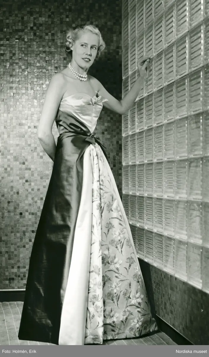 EM, Modellbutiken, Nordiska Kompaniet. Uppvisning i lunchrummet. Damkonfektion. Modell bär aftonklänning i grå brokad och duchesse, samt tvåradigt pärlhalsband.