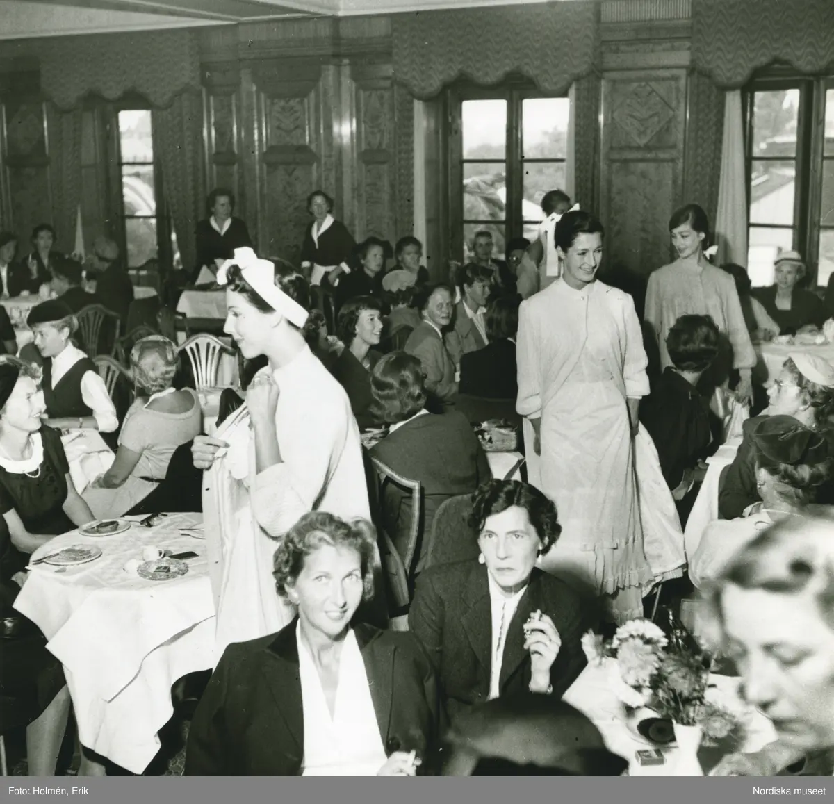 EM, Modellbutiken. Modevisning på Nordiska Kompaniet. Modeller i ljusa kappor och band i håret.