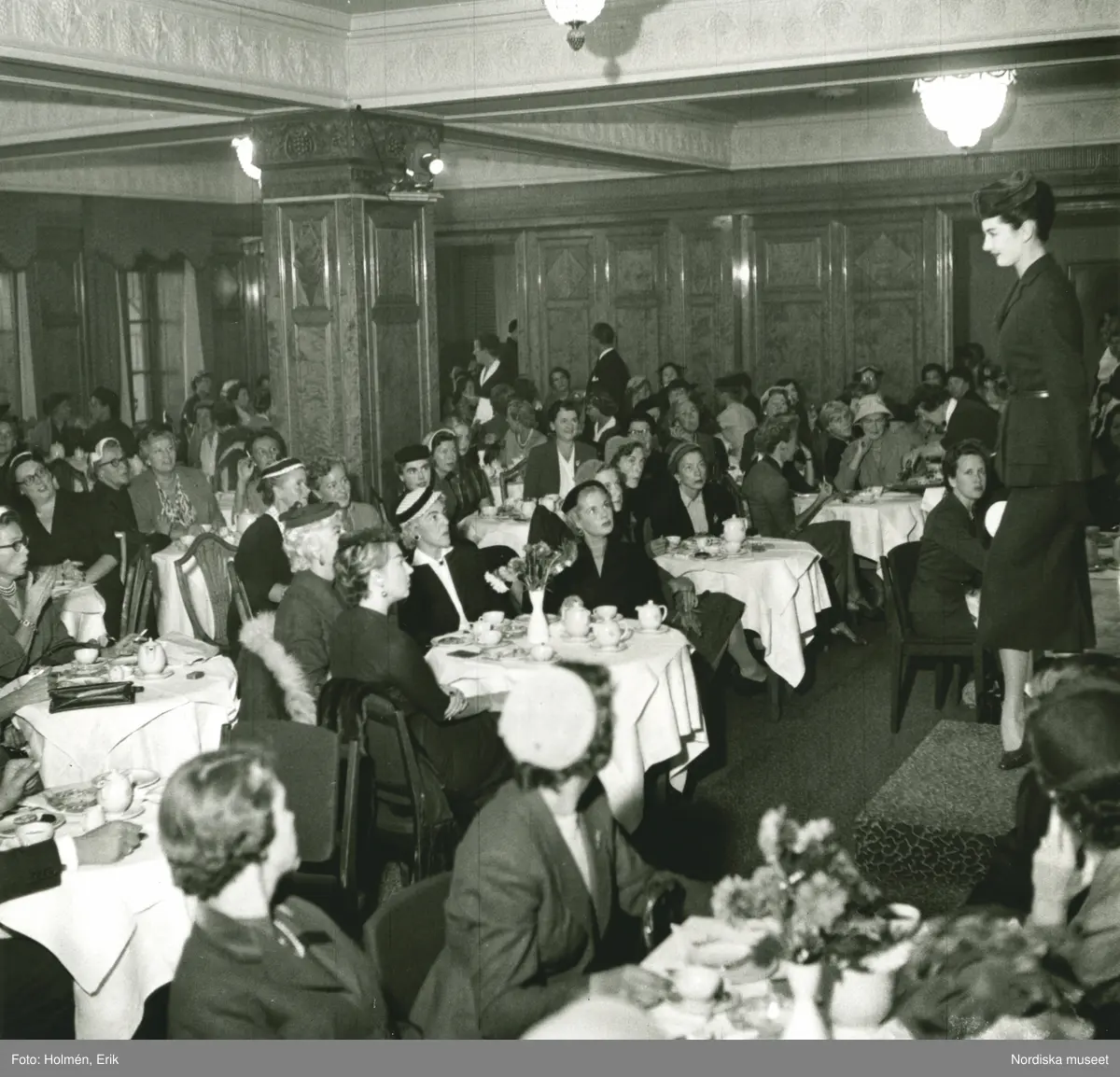 EM, Modellbutiken. Modevisning på Nordiska Kompaniet, Modell i dräkt och hatt på podie.
