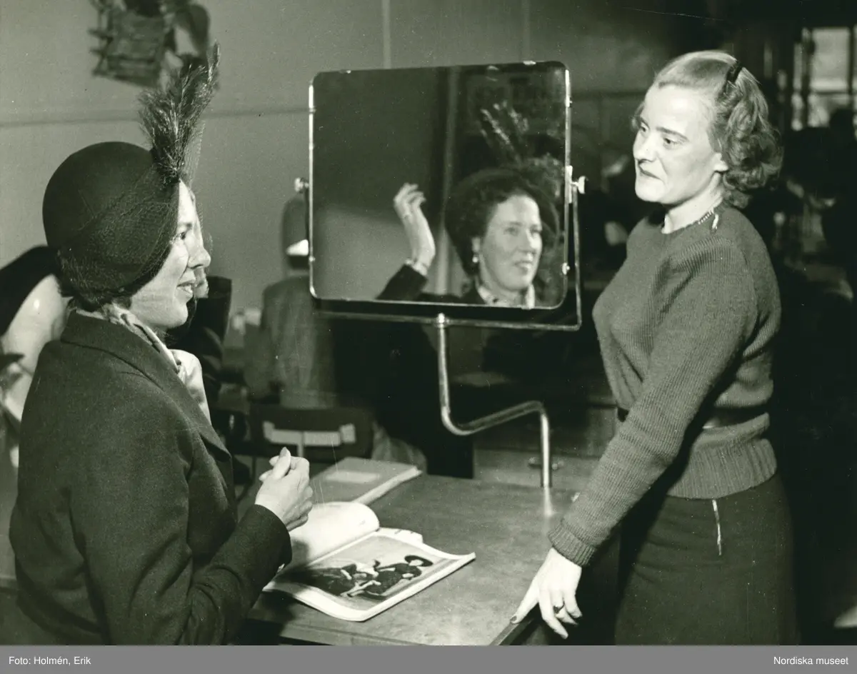FA, Damhattateljén, Nordiska Kompaniet. Föreståndare Fru Altergren och Frk Wahlgren provar hatt med tyll och fjäder.