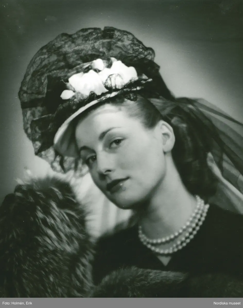 Porträtt av kvinna i hatt med garneringar och tyll, av Monsieur Erik, samt del av päls och treradigt pärlhalsband.