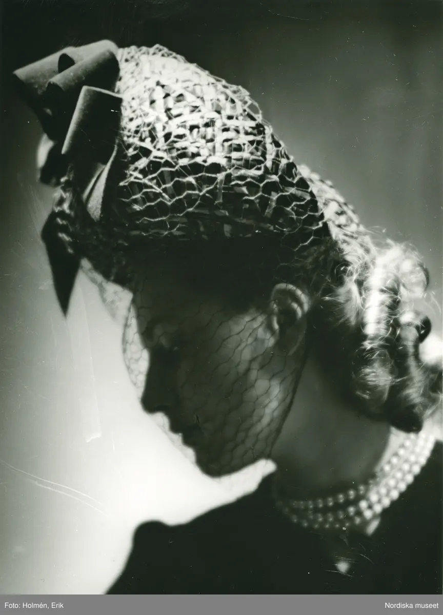 Porträtt av kvinna i hatt med dekorband och flor, samt treradigt pärlhalsband och chinjong, av Monsieur Erik.