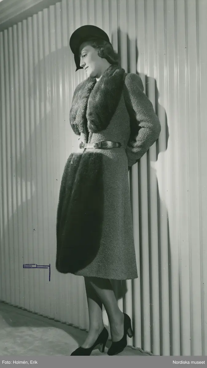 Helporträtt av modell i pälskappa med skärp, hatt och pumps.