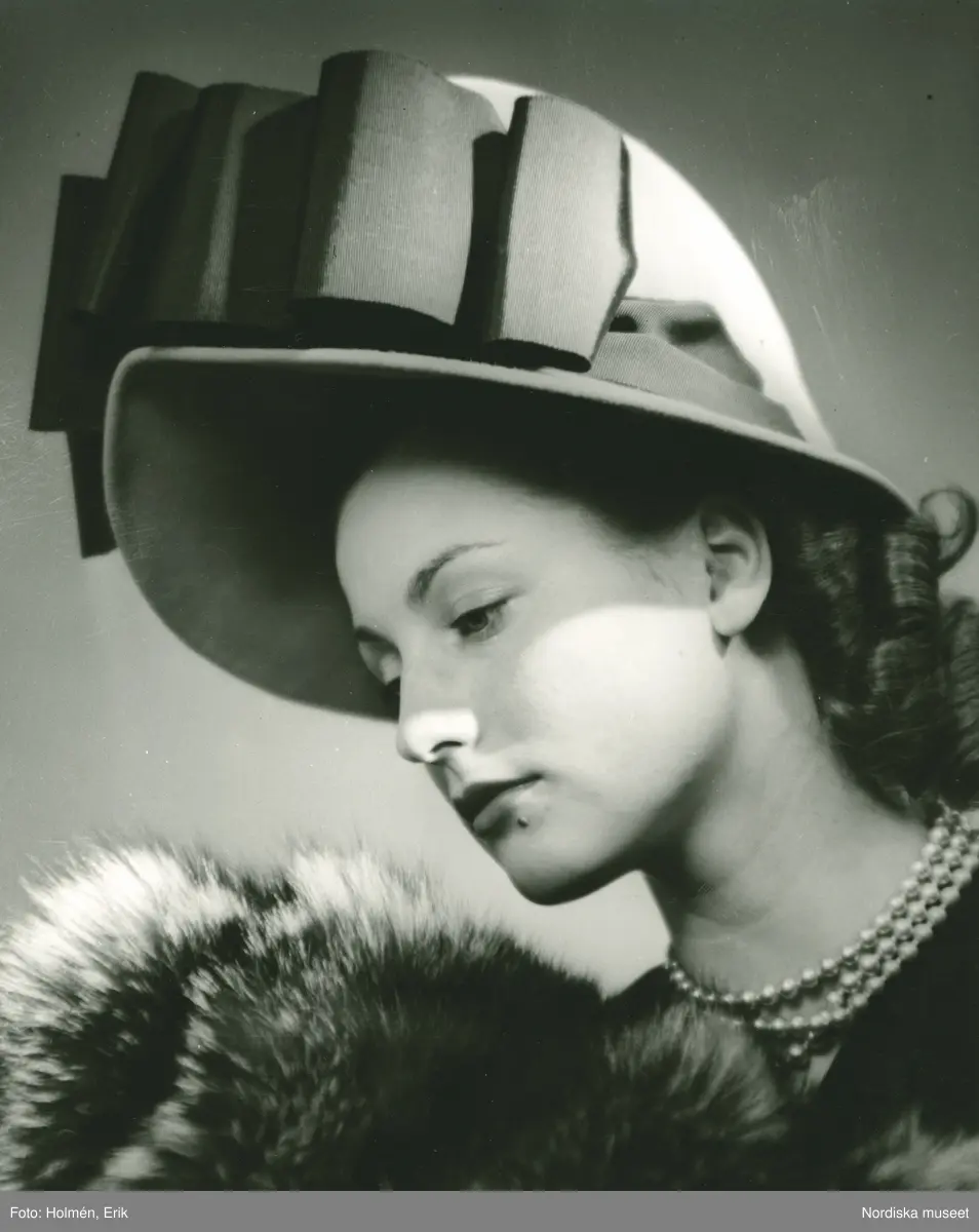 Porträtt av kvinna i hatt med brett ripsband, treradigt pärlhalsband och del av päls, från Monsieur Erik.