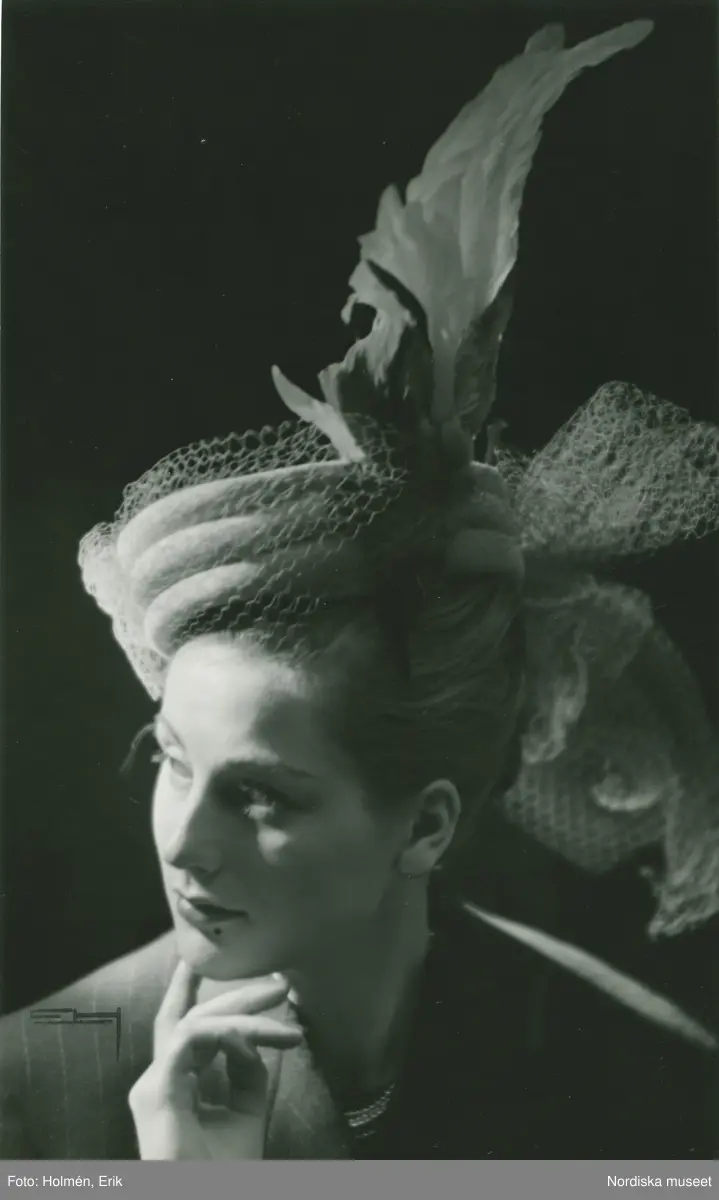 Porträtt av kvinna med hatt i gul filt, fantasi och flor. Uppvisning mars 1947. Hattar använda vid franska avdelningen, av Rose Valois.