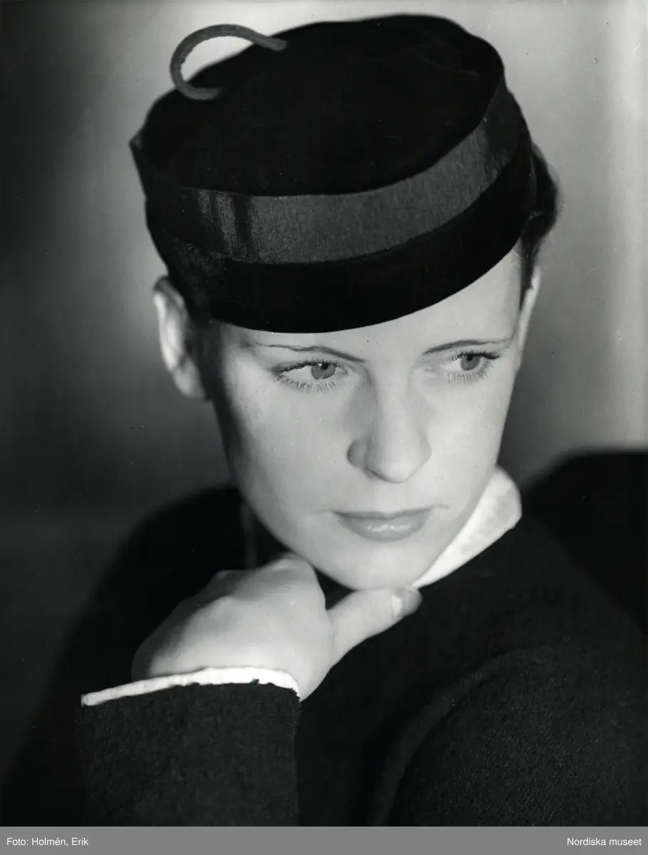 Kvinnlig modell i hatt med ripsband. Nordiska Kompaniet, Stockholm.